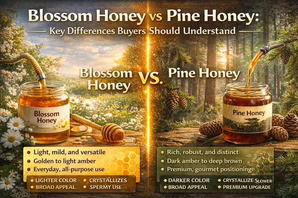 Buyer framing: Treat blossom honey as your core baseline (broad appeal, everyday usage), and pine honey as your portfolio differentiator (distinct sensory identity, premium narrative, and often stronger regional association).
